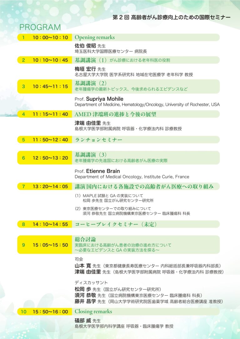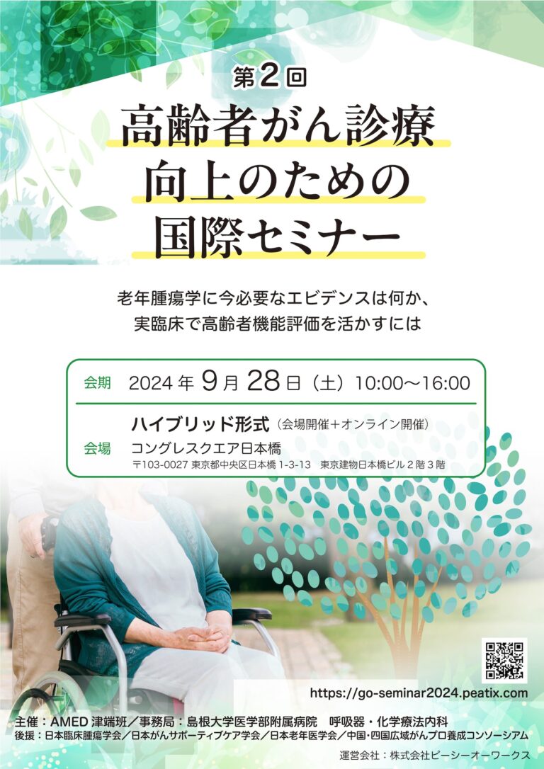 第2回高齢者がん診療向上のための国際セミナー 会期 2024年9月28日(土)10:00~16:00 テーマ 老年腫瘍学に今必要なエビデンスは何か、実臨床で高齢者機能評価を活かすには 開催形式 ハイブリッド開催 場所 コングレスクエア日本橋(東京都中央区)/オンライン(Zoom) ※ 本セミナーは終了しました。多くのご参加ありがとうございました。 添付ファイル(ダウンロードしてご確認ください) 第2回高齢者がん診療向上のための国際セミナー
