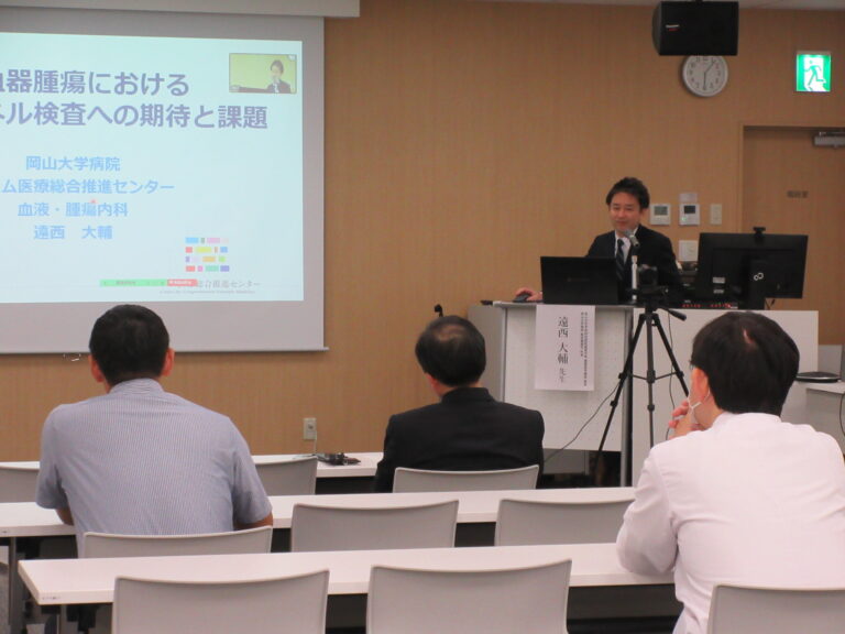 「造血器腫瘍のがんゲノム医療」 日時 2025年9月19日(金)18:00~18:45 場所 島根大学医学部附属病院 だんだん ※ハイブリッド開催 参加者 74名 内容 国内初の造血器腫瘍遺伝子パネル検査「ヘムサイト」が2025年3月1日より保険適用となり、造血器腫瘍における個別化医療が進むと期待されているなかで、がんゲノム医療、造血器腫瘍における遺伝子パネル検査などについて学びました。 講演:「造血器腫瘍における新規がん遺伝子パネル検査の期待と課題」 岡山大学 学術研究院医歯薬学域 腫瘍医学講座教授・岡山大学病院 臨床腫瘍科 科長 遠西 大輔 先生